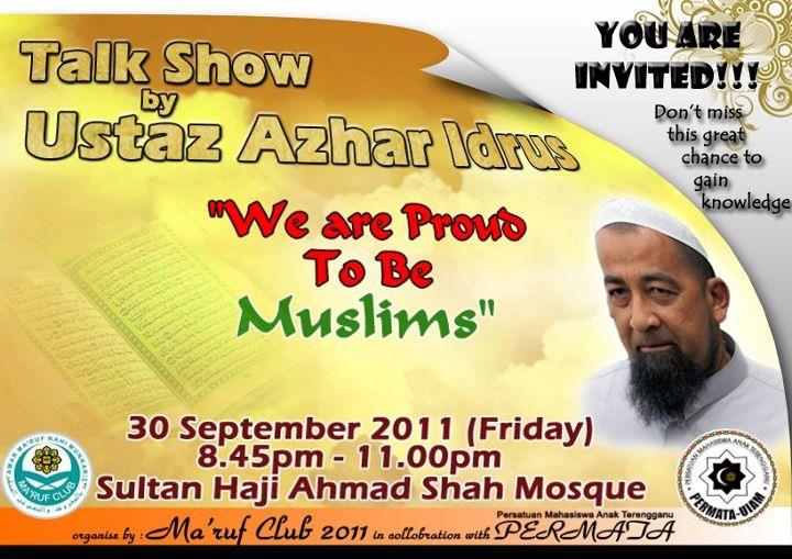 So, hari Jumaat ni aku dah booked untuk attend Majlis Ilmu ni. Penceramah yang tak asing lagi kat Malaysia ni. Siapa jer yang tak kenal dengan nama Ustaz Azhar Idrus yang terkenal dengan trademark beliau 'Bodo'. Haha.